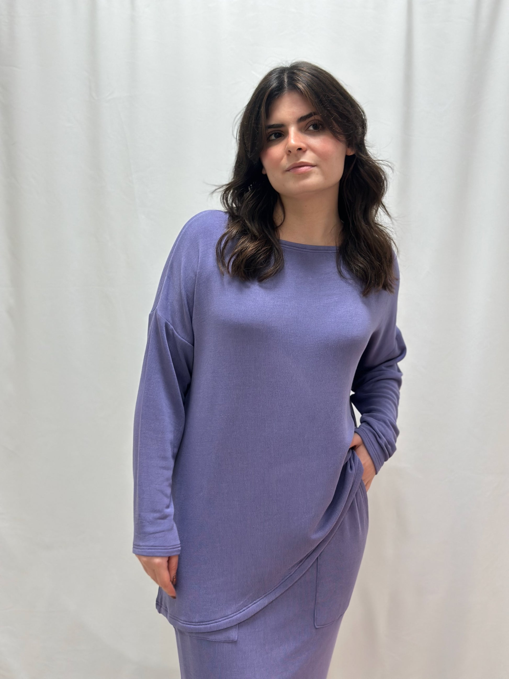 Blusa de manga comprida, de corte largo (oversized), decote à barco e modelo assimétrico, em tecido na cor lavanda.