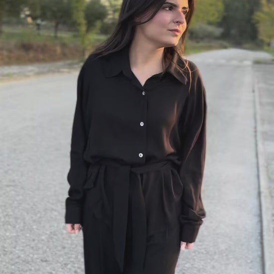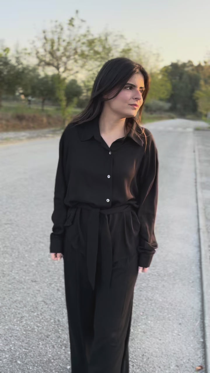 Calças de corte largo, cós trespassado em triângulo, com dois botões e elástico no cós, na parte de trás, em tecido na cor preto. Dois bolsos laterais.