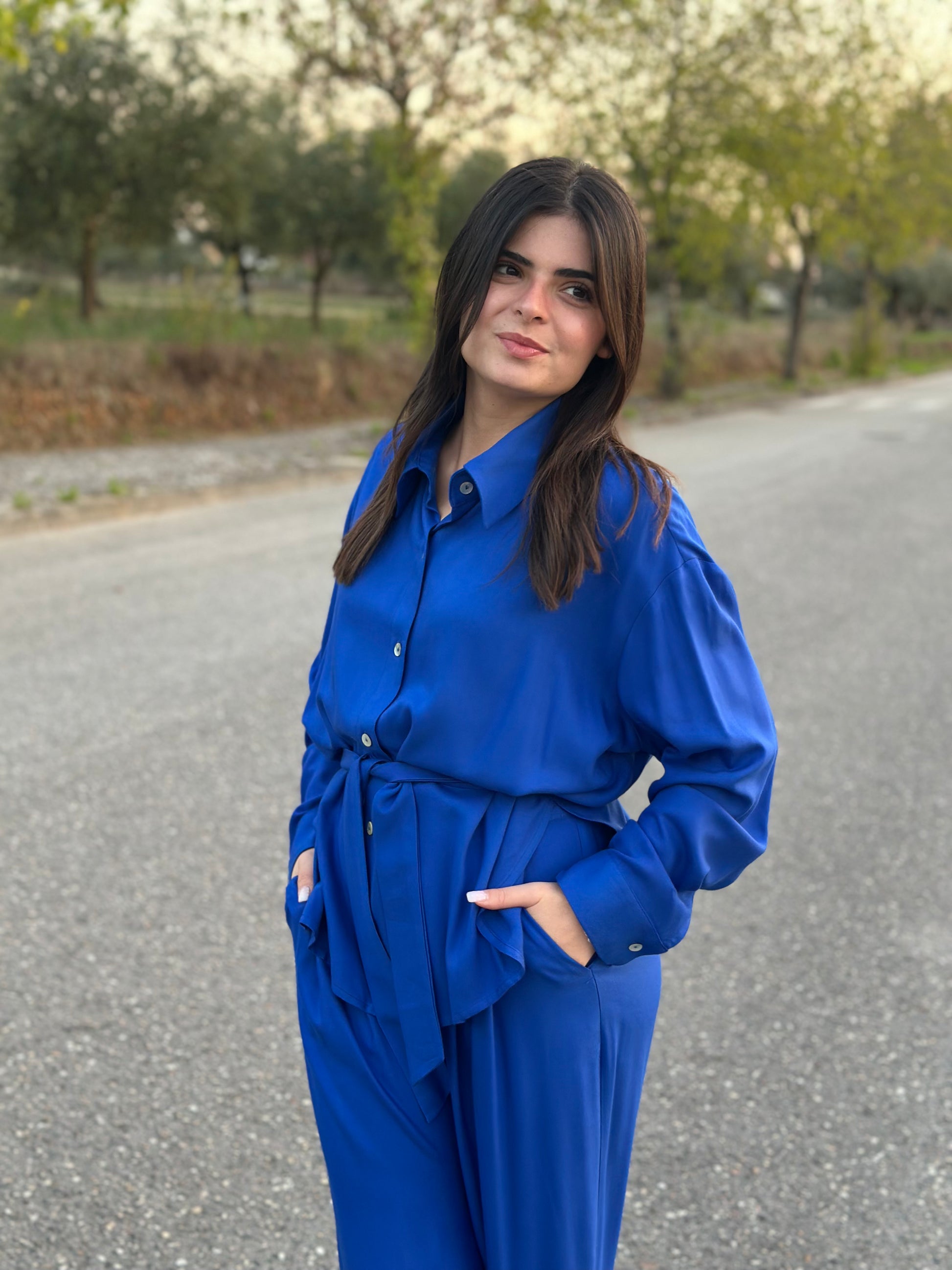 Camisa de manga comprida, de corte largo (oversized), com cinto, em tecido na cor azul.